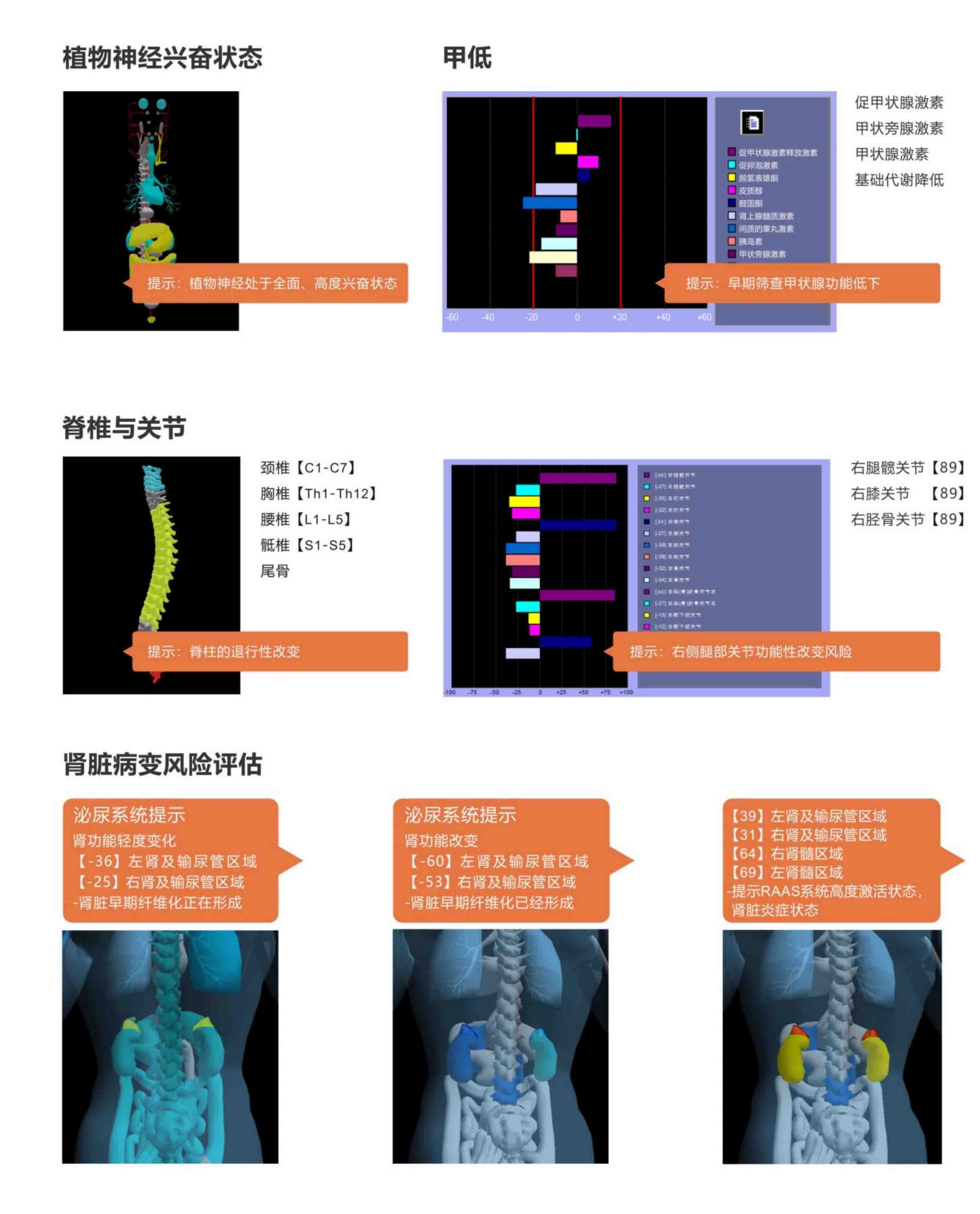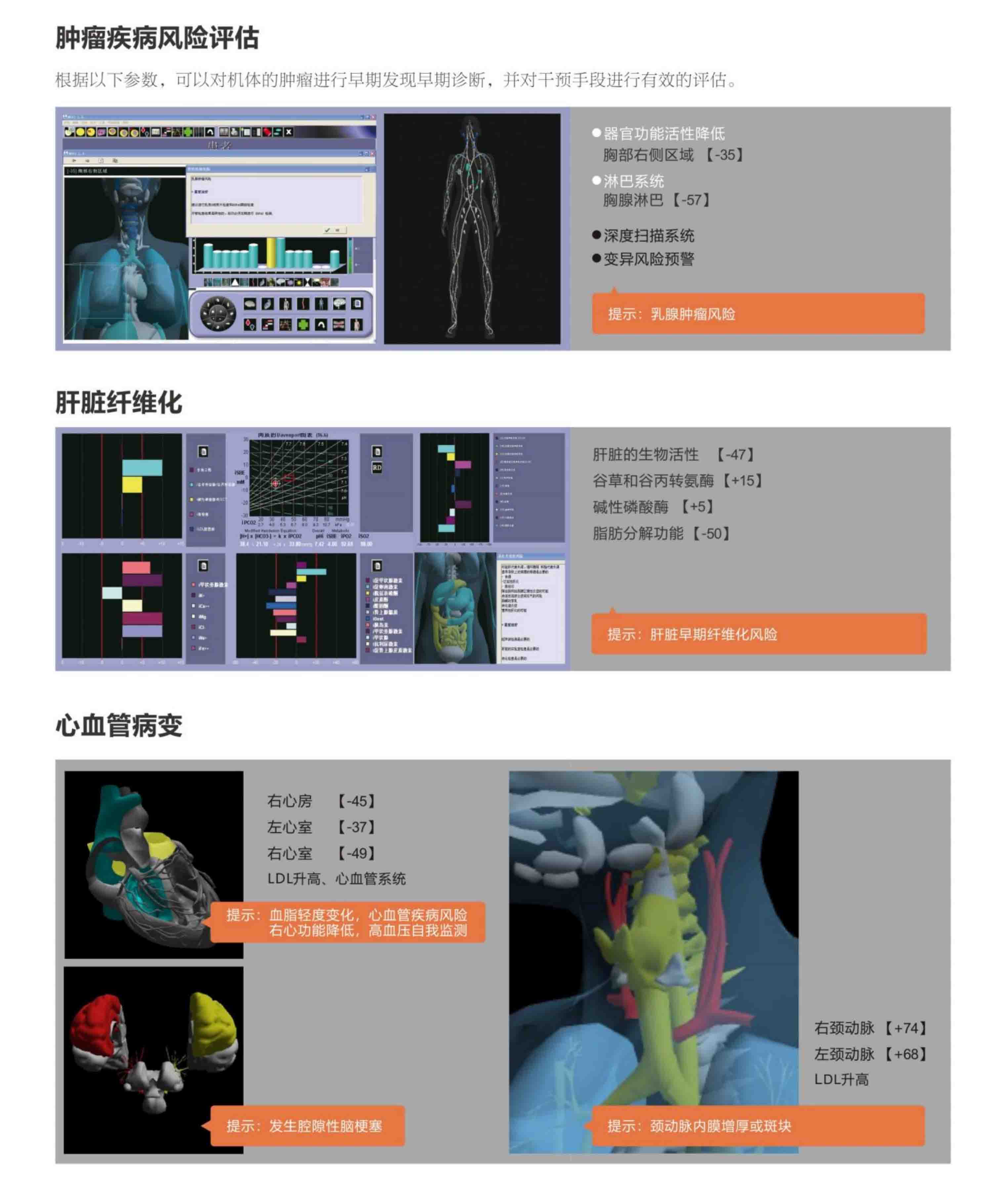 這些信息被用于評估人體各臟器的間質(zhì)細(xì)胞的電生理活性。系統(tǒng)通過即時電流分析法,將這些生理反饋信號進(jìn)行數(shù)字化處理,并以3D成像的方式,形成全身各個部位的三維圖象。這一技術(shù)不僅全面覆蓋了人體的各個系統(tǒng)、組織、器官,還能夠在機體各器官、組織、系統(tǒng)、代謝狀態(tài)等處于功能性病變階段時,就發(fā)現(xiàn)潛在的健康問題。