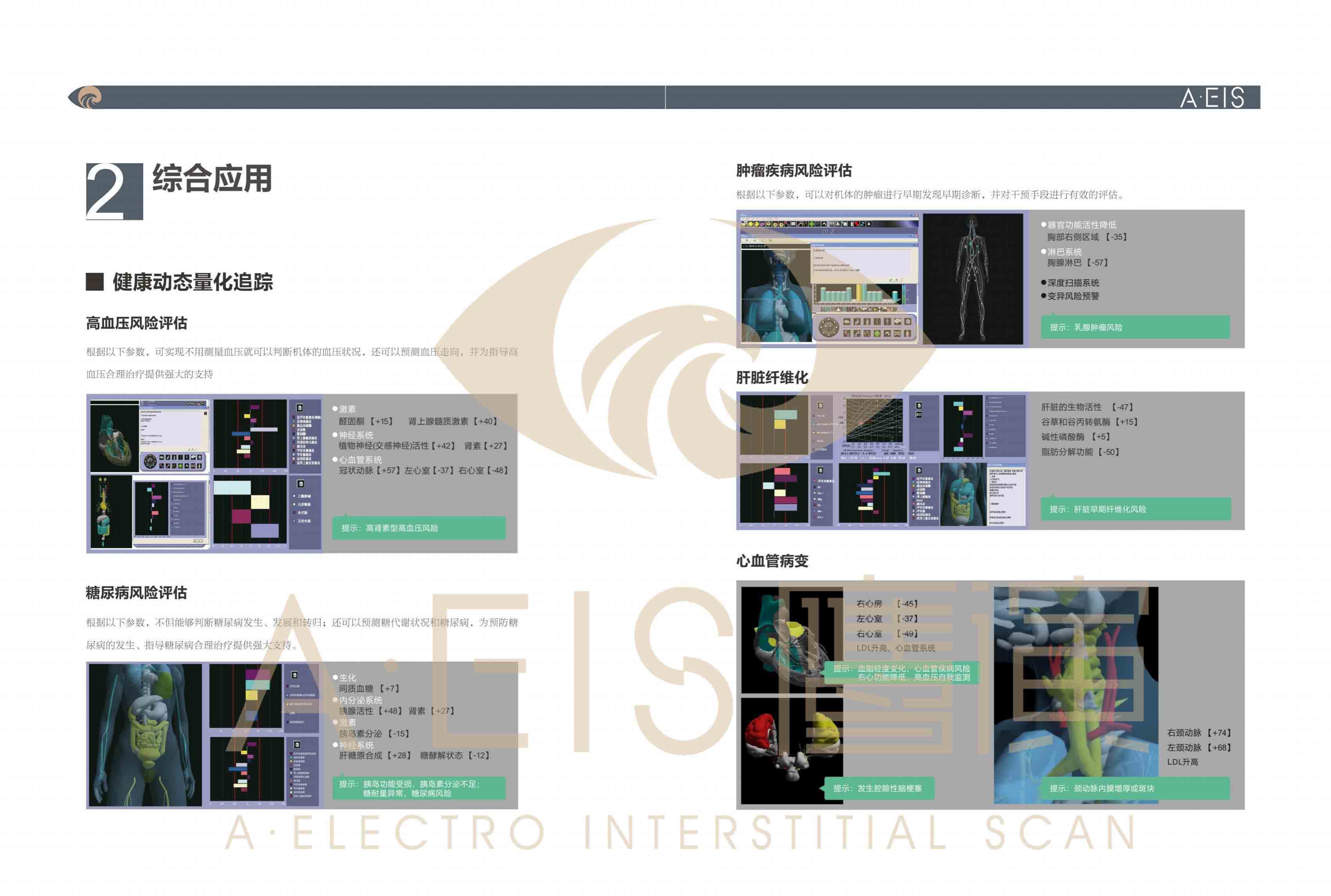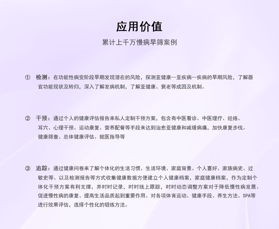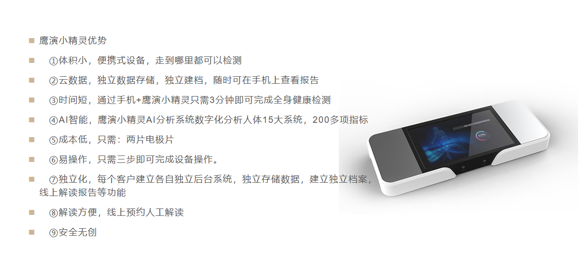 為了響應國家2030年健康中國計劃,實現(xiàn)全民健康的目標,公司歷經3年研發(fā),現(xiàn)重磅推出鷹演—精靈版,在原有的設備基礎上結合了AI智能分析系統(tǒng),擁有強大的云端系統(tǒng),可以幫助每個客戶建立各自獨立后臺系統(tǒng),獨立存儲數(shù)據(jù),建立獨立檔案,線上解讀報告等功能,為健康管理提供了更便利的服務,體驗者輕松在手機上就可操作檢測流程,獲取體檢報告,享受線上解讀報告服務,不僅提升了客戶體驗感,還適應各個場景應用如:健康管理中心,醫(yī)院、康養(yǎng)機構、養(yǎng)老院、社區(qū)店、家庭、企業(yè)等。