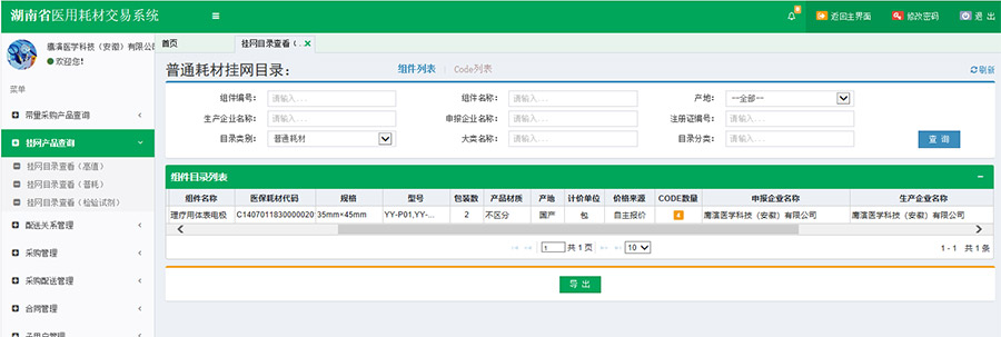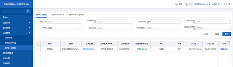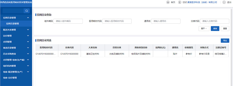 目前鷹演電極片在陜西藥品和醫用耗材招采管理系統、湖南省醫用耗材交易系統、湖北省醫用耗材交易系統、湖北省醫用耗材交易系統、藥品和醫用耗材招采管理子系統掛網。